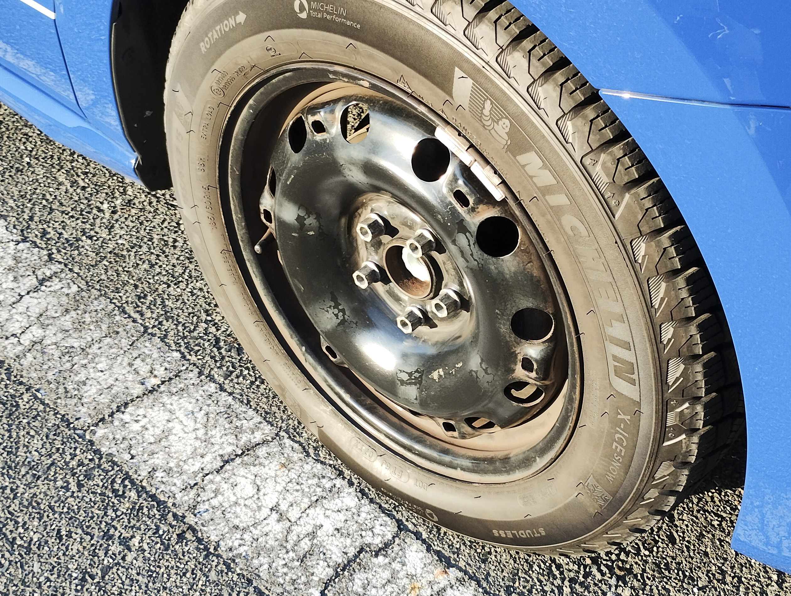 そして冬タイヤを取り付けます。ハブ中央の出っ張りとホイール中央の穴を合わせ、ボルト穴も合わせて、仮止めのため手回しでボルトを取り付けます。下写真はその途中の図で、1本だけ緩んでいるのは回している途中だからです。